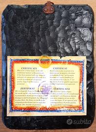 Icona di arte bizantina completamente fatta a mano. Materiale vecchio legno, dipinta con uovo, tempera ed oro su tela. Misure: 23 x 17.5 cm. Con certificato autenticità sul retro.