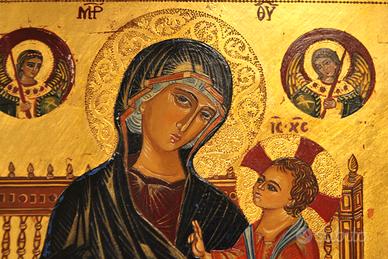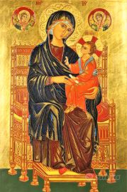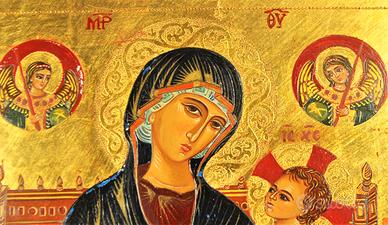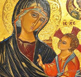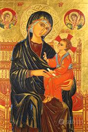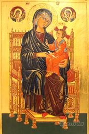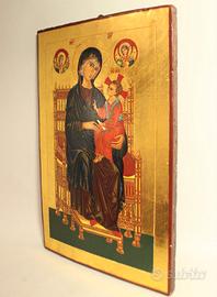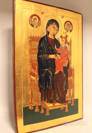 Originale e vecchia icona di scuola Cretese, in stile Bizantino, dipinta a mano e raffigurante una Madonna in trono, con Bambino in braccio a colori vivaci su sfondo oro zecchino.