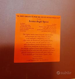 L'abbraccio di Gioacchino e Anna. Icona degli sposi, scritta da N. Secchi della fraternità Monastica di Bose. misure 31x38cm "il mio amato è per me ed io sono per lui” (Ct 2, 16) Dio Signore nostro compassionevole e misericordioso nell’in-principio hai creato l’uomo e la donna a tua immagine e somiglianza e hai voluto che diventassero, quale grande mistero, una sola carne e un solo spirito nella straordinaria vicenda dell’amore reciproco: invia la tua benedizione su di noi che abbiamo sigillato il nostro amore nell’alleanza fedele e concedici di crescere nella fede, nella speranza e nell’amore affinché i nostri giorni scorrano nella gioia e nella pace. Te lo chiediamor Cristo nostro Signore. Amen. https://share.google/cFr4YXLa2whvIBkkF