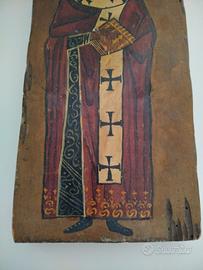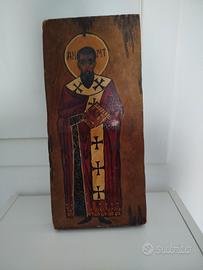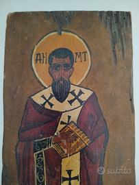 Icona greco ortodossa dipinta interamente a mano, raffigurante probabilmente san Basilio il grande, XIX secolo, ottime condizioni, dimensioni 32,5 x 14,5 cm, spessore 2,5 cm.