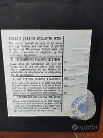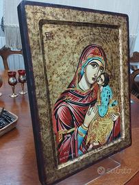 Icona "Madonna con bambino" bizantina fatta mano su una tela speciale applicata su legno. I colori sono fatti con uovo e oro. Misure : larghezza 26 cm x altezza 34 cm. Presenta certificato autenticità con timbro.