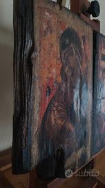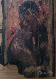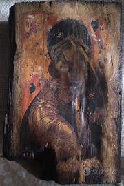 Immagine sacra di arte ortodossa raffigurante la Madonna di Vladimir (Eleousa, che significa "dolce abbraccio, tenerezza" in greco antico), dimensioni 30×20 cm, Immagine su tavola di legno massiccio antico, ridefinita a mano con oro e argento.