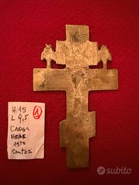 Croce ortodossa russa a bracci tribolati, realizzata un bronzo mediante fusione, tipica della produzione devozionale del XIC secolo. La parte centrale raffigura Cristo Crocifisso, con la testa reclinata e il corpo allungato in stile bizantino. Ai piedi del Crocifisso si trova la figura simbolica della tomba di Adamo, con il teschio visibile in basso, mentre ai lati della croce scorrono iscrizioni in slavo ecclesiastico con le abbreviazioni tradizionali: