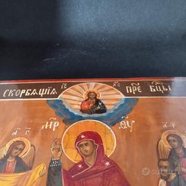 Bellissima Icona Russa Del XIX Secolo rappresentante la Madonna " Gioia di Tutti gli Afflitti ' dipinta su tavola di legno. Scuola della Russia settentrionale del XIX secolo. TonaBellissimalità brillanti. La MaBellissimadre di Dio vestita in abiti regali intercede per l'Umanita' presso Dio circondata da gruppi di Santi e bisognosi che invocano il suo aiuto. Tavola in buone condizioni come si vede dalle foto allegate. Allegato all'icona certificato di autenticità. Dimensioni: 22,5x 26,5 cm altezza 1,8 cm.