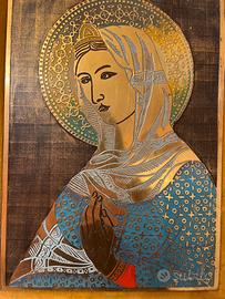 Vendo bellissima icona sacra raffigurante la Madonna in stile bizantino, realizzata su tavola in legno con lavorazione dorata e dettagli dipinti a mano in toni