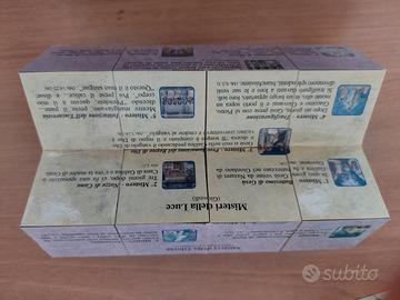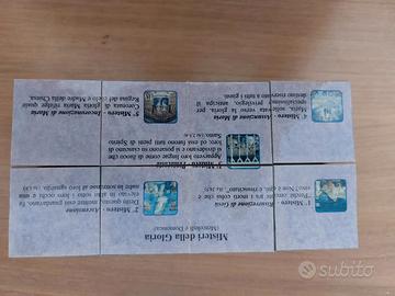 Piccole icone con soggetti sacri, in legno con supporto per alzarli inclinati (per appoggiarli su uno scaffale o una scrivania). Molto belli e molto discreti, viste le piccole dimensioni (5 cm circa di lunghezza). Ideali come piccolo regalo ai bimbi in occasione della Santa Cresima o Comunione. Nelle ulteriori foto sono rappresentati dei cubi cartonati (anche questi ultimi di pochi centimetri di lato), apribili su tutte le loro facce. Su ogni faccia del cubo, anche su quelle interne, parti di preghiere. I cubi in questione contengono il Padre Nostro e la lettura del Santo Rosario. Un modo originale, quasi un gioco, per raccontare e far leggere ai bimbi le preghiere tradizionali. Le icone sono assolutamente nuove, ancora nella originaria confezione, mentre i cubi sono stati usati. Sono comunque in condizioni ottime, perfettamente utilizzabili e leggibili. Il tutto euro 20. Ritiro o spedizione a carico dell'acquirente