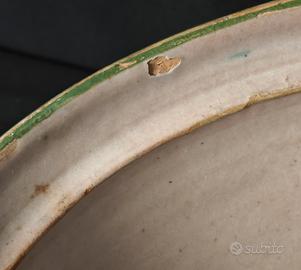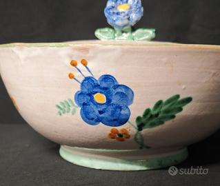Zuppiera in ceramica vietrese prodotta dalla manifattura ICS, databile tra gli anni ’20 e ’30. Realizzata e decorata a mano secondo la tradizione di Vietri sul Mare dell’ epoca , presenta un elegante motivo floreale policromo con fiore blu centrale, dettagli verdi ramina e tocchi giallo/arancio. Il coperchio è arricchito da un caratteristico pomolo modellato a forma di fiore 📏 Dimensioni • Diametro: 29 cm • Altezza con coperchio: circa 15 cm ✔️ Ottime condizioni generali per l’età, presente una piccola sbeccatura sul bordo visibile in foto. Esemplare sempre più raro da trovare in queste condizioni. 📌 Sono disponibili più pezzi dello stesso servizio (9 mezzaluna totali, 1 salsiera e 1 zuppiera), tutti in ottime condizioni. Possibilità di acquisto multiplo o in lotto. Contattatemi per info sulla disponibilità dei pezzi. ✅ Spedizione sicura con imballaggio antiurto ✅ Per ulteriori informazioni non esitate a contattarmi Mercatino dell'antiquariato Tiriciclo , Salerno