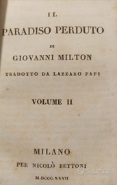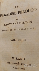 Il paradiso perduto Giovanni Milton tradotto Lazzaro Papi anno 1827 Milano per Nicolò Bettoni sono tre volumi in uno in buone condizioni