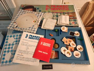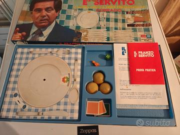 Gioco in scatola vintage "Il pranzo è servito" completo in discrete condizioni, normali, segni di usura e del tempo. Scatola intefra ma purtroppo "segnata" dal nastro a desivo.