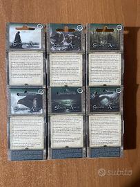 Tutti e 6 i pack: 1) ALLA RICERCA DI GOLLUM 2) SCONTRO ALLA CARROCCIA 3) VIAGGIO A RHOSGOBEL 4) I COLLI DEGLI EMYN MUIL 5) LE PALUDI MORTE 6) RITORNO A BOSCO ATRO In ottime condizioni. Ci sono alcuni difetti su alcune scatole. E poi ci sono leggeri difetti su 3 carte come si vede nelle ultime 3 foto. Infine tutte la carte giocatore in ciascun pack hanno un bordo leggermente ingiallito, come si vede nella terza foto (arrivate già così!)