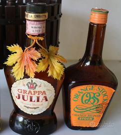 INTROVABILE e PEZZO UNICO. La confezione si compone di 5 bottiglie piene e sigillate con un torchietto di legno all’interno dell’originale scatola. Le bottiglie da lt. 0,75 sono: CHERRY con le ciliegine – AMARO RADIS - ROYAL STOCK – GRAPPA JULIA con foglie d’uva – ORANGE BRANMDY. Le bottiglie e il torchietto sono perfette, con il sigillo ministeriale e il tutto è stato conservato all’interno della scatola originale e dimenticate in una cantina sempre al buio. Solo la scatola esterna ha subito dell’umidità che ha distrutto il fondo e parte di un lato. Da COLLEZIONISMO. Non esiste in internet nessun riscontro di oggetto simile. Occasionissima.