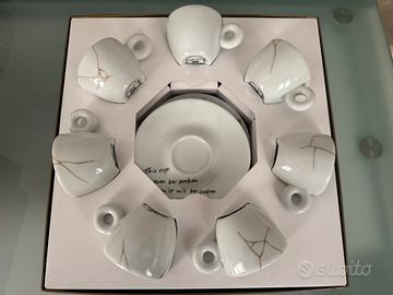 MENDED CUPS è la collezione di arte di illy realizzata da Yoko Ono. Sei tazzine presentano linee dorate che seguono le cicatrici di rotture riparate, una è bianca, integra, e sul piattino è riportata la scritta evocativa: