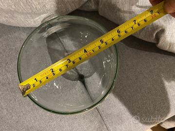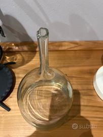 Piccole bolle d’aria e ondulazioni nelle pareti di vetro attestano la produzione artigianale di questo imbuto, utilizzato un tempo per travasi in cantina o in piccoli laboratori. Il collo di questi oggetti mostra spesso i segni irregolari del taglio a mano che li separava perché venivano soffiati in sequenza da un tubo di vetro in comune.