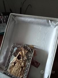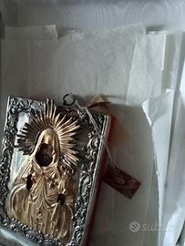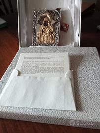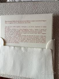 riproduzione di icona sacra antica di Luca evangelista creata su tavola in legno con parti in argento e doratura come da garanzia allegata la scatola è rivestita in raso le misure sono..... lunghezza 9 cm altezza 11 cm UTILE PER CRESIMA O COMUNIONE