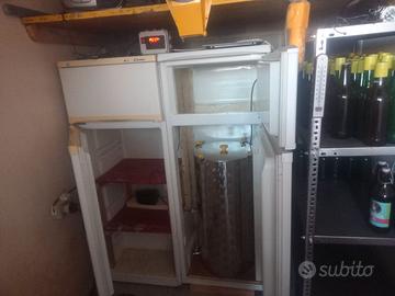 Cella artigianale (molto ben studiata, secondo me migliori di certe celle in commercio) composta dall'unione di 2 frigoriferi comandati da un termostato di utilizzo molto intuibile , in grado sia di riscaldare che di refrigerare così da poter creare la vostra birra tutto l'anno indipendentemente dalla temperatura esterna, inoltre nella zona di destra viene posizionato il fermentatore mentre a sinistra c'è il posto per far fermentare le bottiglie già imbottigliate.