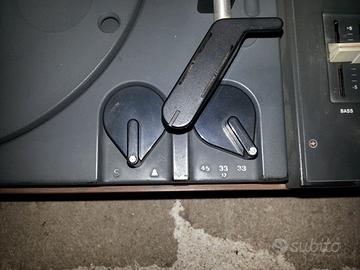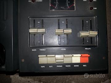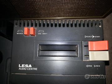 Impianto Hi fi LESA composto da: Giradischi per ascolto di 45 giri, Long playing e i vecchi 33 giri degli anni 30 Audio cassette con possibilità di registrare la traccia proveniente dal giradischi o dalla radio. Radio con possibilità di memorizzare 7 stazioni Mixer. 2 casse coeve. Molto raro e autentico! Le audio cassette vanno aiutate nell'uscita I cursori delle regolazioni sono appoggiati sui potenziometri Video you tube : stereo lesa