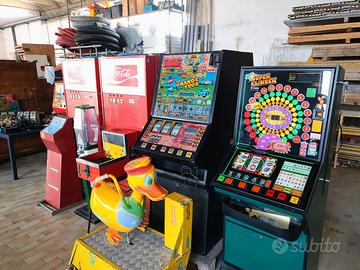 vendo in blocco n11 pezzi: 2 frigo CocaCola n2 slot la grande fuga da ripristinare N1 dondolante anni 60 N1 mini pista anni 70 N1 slot super camble N1 slot da banco Happy Days, da ripristinare trattabile dopo visione N1 despencer anni70 N1 insegna catena ristoro Ciao N1 gioca riflessi anni 70 in più fornisco pezzi di ricambio per le slot trattabile dopo visione