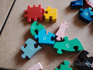 in legno levigato e colorati di tutti i colori, nuovi con numeri lettere visibili. non ha schegge ed e nuovo