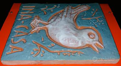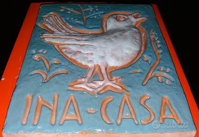 Introvabile formella decorativa in maiolica policroma da collezione, anni 50, con disegno in rilievo e scritta incisa, vera icona dell'architettura dell'Ina Casa. La targa è originale, integra e mai posta in opera e di presenza è molto più bella di quanto non appaia in foto.