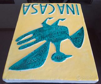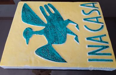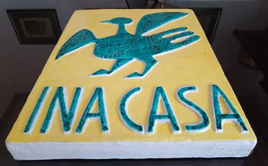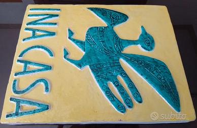 Iconica e ormai introvabile mattonella decorativa in maiolica policroma realizzata nel corso degli anni 50 dall'illustre artista faentino GUERRINO TRAMONTI per il piano INA Casa. La targa è originale, integra, mai posta in opera e si presenta in perfetto stato. Sia il disegno e sia la scritta sono di un bellissimo turchese in rilievo su fondo giallo Le sue dimensioni sono: L. 26 cm x L. 20,5 cm circa con spessore 2,5 cm. Il peso di Kg 1.50. Un piccolo capolavoro realizzato da uno dei maggiori artisti del novecento Italiano che oltre ad essere un elemento distintivo e caratterizzante del predetto piano testimonia un periodo di grande ripresa economica, sociale ed artistica dell'Italia del dopoguerra. Per la realizzazione di queste targhe furono infatti indetti a partire da giugno 1952 appositi concorsi ai quali parteciparono aziende artigiane o industriali di ceramiche e artisti di rilievo nazionale quali Massimo Baldelli, Irene Kovaliska, Pietro De Laurentiis, Publio Morbiducci, Guerrino Tramonti, Alberto Burri, Duilio Cambellotti, Leoncillo Leonardi, Piero Dorazio ed altri.