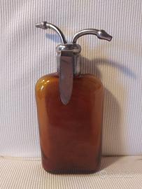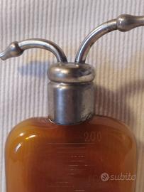 Questo oggetto è un affascinante pezzo di storia medica: si tratta di un inalatore di vapore (o nebulizzatore) d'epoca, probabilmente risalente alla prima metà del XX secolo. Questo strumento veniva utilizzato per somministrare farmaci per via inalatoria o per praticare l'anestesia locale (spesso con etere o cloruro di etile) prima di interventi minori. La boccetta In vetro ambrato per proteggere i medicinali fotosensibili. La scala graduata (fino a 200 ml) serviva a dosare con precisione il liquido. Il beccuccio doppio: Una delle "corna" serviva per l'immissione dell'aria (spesso collegata a una pompetta di gomma manuale oggi mancante), mentre l'altra serviva per la fuoriuscita del vapore o del farmaco nebulizzato che il paziente doveva inalare.