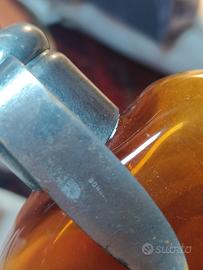 La leva metallica: Il braccio metallico che si vede sul retro serviva probabilmente a fissare il tappo a pressione o a regolare il flusso. si nota una punzonatura sul metallo. Anche se non è del tutto leggibile, sembra riportare una marca o un brevetto (potrebbe esserci scritto "BOHM" o simili, riferito a produttori tedeschi o centro-europei di strumenti chirurgici). il tappo sembra non aprirsi.