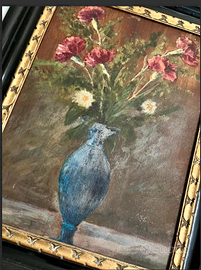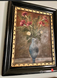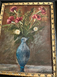 INCANTEVOLE dipinto olio su tela raffigurante "FIORI in VASO BLU", racchiuso in preziosa cornice d'epoca decorativa. ANTICO riconducibile al '900. CONDIZIONI: ottimo stato conservativo ma essendo un articolo antico/vintage può presentare i lievi segni del tempo che ne attestano l'originalità e il fascino. Proveniente da collezione privata Villa Veneta del '900. MISURE: L38xh48cm c.a. DETTAGLI: Questo dipinto a olio su tela rappresenta una natura morta floreale, un genere artistico cha ha goduto di grande popolarità tra la fine del XIX e l'inizio del XX secolo. Le nature morte floreali erano apprezzate per la loro capacità di catturare la bellezza effimera della natura e per il loro valore decorativo negli interni domestici. La composizione con fiori rosa e bianchi in vaso blu, richiama lo stile impressionista e post-impressionista, caratterizzato da pennellate visibili e una palette cromatica vivace.