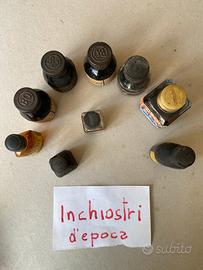 Stock di 9 bottigline di inchiostro d’epoca. Condizioni: bottiglie e tappi e scritte integre, inchiostro secco.