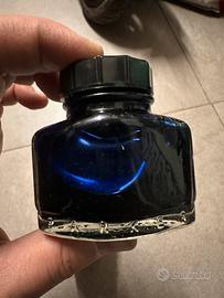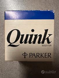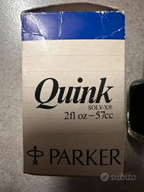 bottiglia vintage di inchiostro per penne stilografiche Parker Quink con formula Solv-X. Marca: Parker. Prodotto: Inchiostro per stilografica, serie Quink. Caratteristiche: Formula Solv-X, progettata per pulire la penna durante l'uso. Contenuto: Flaconi simili contengono tipicamente 57 ml di inchiostro. Bottiglia piena, colore blu Ritiro a mano a Modena/Bologna stazione possibilità di spedizione