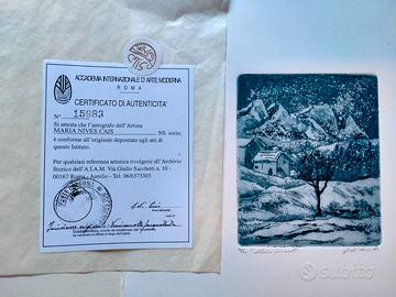 Vendo splendida opera d'arte originale dell'artista Maria Nives Cais, un'incisione/acquaforte di paesaggio invernale. Esemplare numerato 26/50, il che garantisce la sua rarità e valore. Fornita con Certificato di Autenticità N° 15983 dell'Accademia Internazionale d'Arte Moderna (A.I.A.M.) di Roma, che ne attesta la firma dell'Artista. Ottime condizioni, pronta per essere incorniciata. Ideale per collezionisti d'arte moderna e contemporanea.