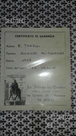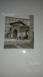 incisione all'acquaforte di Roberto Tonelli realizzata nel 1998 e raffigurante via Calzolai a Piacenza con certificato di garanzia - 33x43 cm - cornice 5 cm
