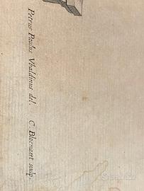 L'incisione presenta segni del tempo che ne attestano l'età, inclusi leggere fioriture e macchie di umidità, particolarmente evidenti sui margini, che tuttavia non compromettono la leggibilità e l'impatto visivo dell'immagine centrale. Questi dettagli contribuiscono al fascino e all'autenticità di un pezzo storico.