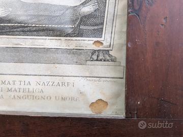 Splendida e rara testimonianza di arte devozionale marchigiana della fine del XVIII o inizio del XIX secolo. Si tratta di un'incisione calcografica (acquaforte/bulino) su carta che ritrae l'effigie del corpo incorrotto della Beata Mattia Nazzarei (1253–1319), celebre Clarissa di Matelica.