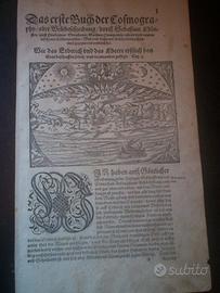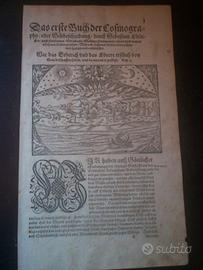 Si tratta di un paginone tratto dall’ importantissima “Cosmographia” di Sebustian Munster, (Basilea 1570 ca.) rappresentante scena altamente simbolica: la GENESI del mondo! Quindi adatta come regalo per un matrimonio, laurea, o evento! Le foto non rendono la bellezza dell’incisione e del foglio con quasi mezzo millennio di vita!