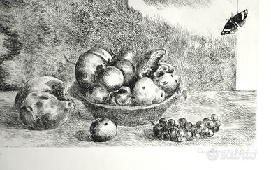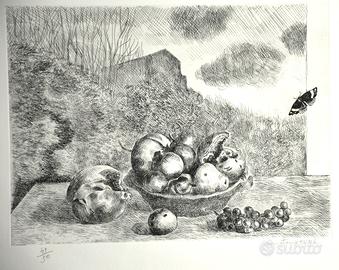 Incisione originale su carta pregiata realizzata dall’artista Carotenuto nel 2006, raffigurante una raffinata natura morta con frutti e farfalla. L’opera mostra una composizione equilibrata: un cesto di melograni e mele in primo piano, accompagnati da un grappolo d’uva, mentre sullo sfondo emergono ombre e un cielo con nuvole finemente tratteggiate. A destra, una farfalla sospesa dona leggerezza alla scena.