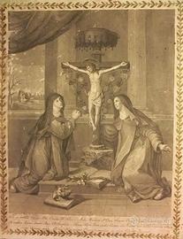 DESCRIZIONE: Incisione fissata su tela con telaio perimetrale in legno. Opera di Girolamo Carattoni della seconda metà del sec. XVIII. Sacro crocifisso ed effigie della B. Felice Meda da Milano, beata religiosa clarissa, fondatrice del Monastero del Corpus Domini di Pesaro.