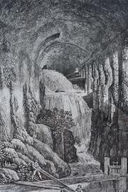 Si tratta di una stampa d’epoca finemente realizzata con tecnica calcografica, ricca di dettagli architettonici e naturalistici. L’opera mostra una veduta suggestiva del complesso della Villa di Mecenate a Tivoli, con una cascata scenografica, colonne romane e figure umane in abiti d’epoca, impegnate in attività idrauliche.