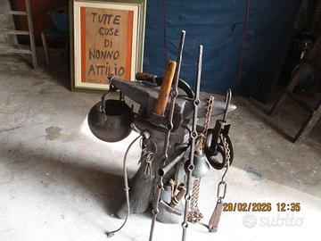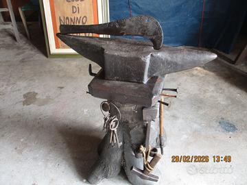 incudine in ferro su suo piedistallo di circa 35 kg con cose sempre in ferro battuto o forgiato( martello-tenaglie- roncola con incisione-brocca per acqua pozzo- piccola incudine battifalce a gradino-campa125.220nella in bronzo funz a 125-220- due tipi di ascia grande e piccola- ruota con attacco