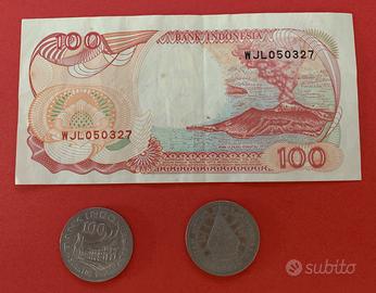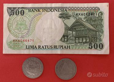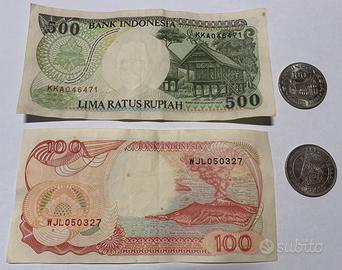 Banconota 500 Rupiah 1992 orango e capanne indigene Kalimantan + Banconota da 100 Rupiah del 1992 con Barca a vela Pinisi e Vulcano Anak Krakatau. 2 monete da 100 Rupiah. Euro 10 Alfredo 339 89.26.155