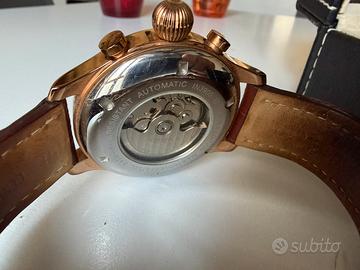 Vendo Ingersoll Apache ref. IN3900 RG, orologio automatico originale con finitura rose gold, quadrante chiaro e cinturino in pelle marrone. Modello dal design classico e molto elegante, con indicazione giorno/data e quadrante multi-contatore. L’orologio è perfettamente funzionante e si presenta in ottime condizioni generali, con normali lievi segni compatibili con il tempo. Presente scatola originale e cartellino del rivenditore con data di acquisto giugno 2011. Caratteristiche: - Referenza IN3900 RG Apache - Movimento automatico - Giorno e data - Quadrante multi-contatore - Finitura rose gold - Cinturino in pelle - Scatola originale - Cartellino negozio con data acquisto Orologio di grande presenza al polso, ideale sia per utilizzo personale sia per appassionati del marchio. Prezzo: 169 € trattabili