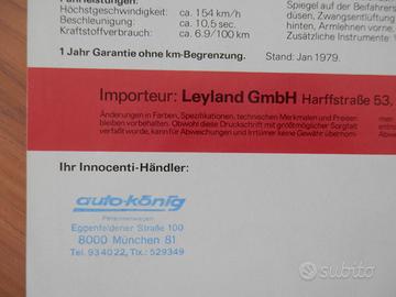 Vendo depliant originale per l'Innocenti De Tomaso nel 01/1979 con 2 pagine in lingua tedesca e ottima condizione come da foto.