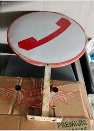 Insegna telefonica vintage bifacciale SIP, in metallo bianco e rosso, utilizzata in prossimità delle cabine telefoniche pubbliche.