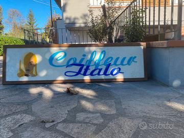 Insegna in vetro fusione Anni 70/80 “Coiffeur Italo”cornice e controcornice in legno fondo dí truciolato 140x 38 x 3 con ganci per appenderla. Molto bella segni del tempo , ma veramente di ottima fattura. Credo che possa pesare intorno ai 10kg.Preferibile ritiro a mano , zona Arezzo. Se spedito bisogna concordare prezzo