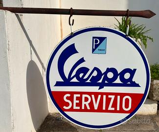 Rara insegna smaltata bifacciale a bandiera VESPA SERVIZIO diametro cm 80 completa di staffa cm 140 e anelli per fissaggio. Tutto originale anni 50/60 conservato in ottime condizioni.