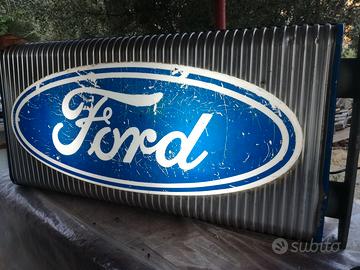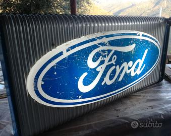 Insegna Ford ricondizionata. Sistema elettrico rifatto a nuovo. Come da foto, presenta 2 lesioni sulla plastica da un lato. Dimensioni: 128×60×16 cm (profondità max 20 cm con sporgenza centrale). Solo ritiro a mano. No spedizioni. Visto e piaciuto.