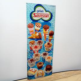Insegna Gelati Sanson, buone condizioni, presenta segni del tempo, dell'utilizzo e tracce di nastro adesivo sulla scritta Sanson in alto.