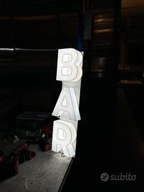 Insegna luminosa ‘ BAR ‘composta da lettere scatoate in plexiglas opalino spessore 8 cm e altezza ogni lettera 20 cm, il tutto è disposto in verticale. le lettere sono cablate con LED ad alta luminosità e 6500 K e il tutto viene fornito con Alimentatore e spina domestica On/off .