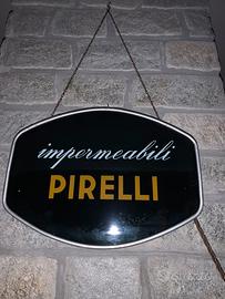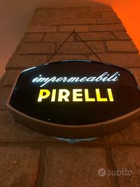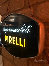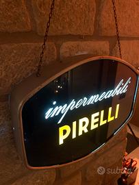 Rarissima insegna luminosa pubblicitaria in vetro Impermeabili Pirelli. Vintage fine anni’50. Struttura cornice in metallo e frontale vetrofania. Misura 40x30x7cm.circa. Usata e vissuta ma in buone condizioni estetiche( impianto elettrico rifatto di recente).