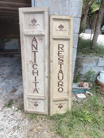 insegna con scritta manuale per attività di restauro ed antiquariato realizzata su antichi scuretti di finestre