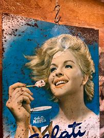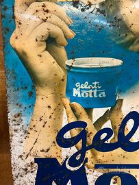 Autentica insegna pubblicitaria originale “Gelati Motta” risalente agli anni ’50/’60, prodotta dalla storica Scamet di Torino, testimonianza concreta della grande stagione della grafica italiana del dopoguerra. Un oggetto iconico che racchiude tutto il fascino della pubblicità d’epoca, con l’inconfondibile immagine della giovane donna sorridente che regge la coppetta Motta, simbolo di un’Italia che riscopriva leggerezza, colore e ottimismo.